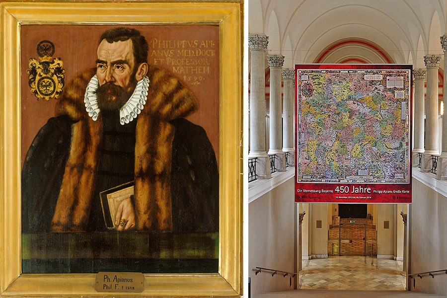 Links: Philipp Apian (1531-1589), als Professor an der Universität Tübingen. Gemälde von Hans Ulrich Alt, 1590, Tübinger Professorengalerie. Rechts:. Philipp Apians Große Karte im Treppenaufgang der Bayerischen Staatsbibliothek München