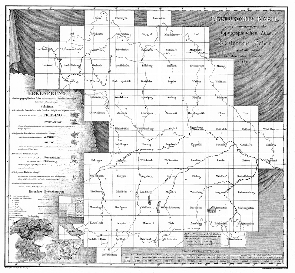 200 Jahre amtliche Topographische Karten veranschaulichen die Entwicklung der Kartographie von ihren Anfängen bis in die Gegenwart. 1812 legte das Topographische Bureau unter König Max I. Joseph das erste Kartenblatt der Region um München für den Topographischen Atlas von Bayern vor — die Geburtsstunde der heutigen Amtlichen Topographischen Karten, die bis heute von der Bayerischen Vermessungsverwaltung herausgegeben werden.