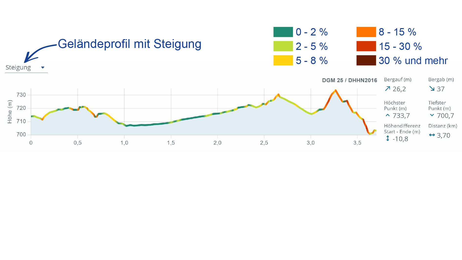 Sobald ein Element gezeichnet wurde, werden unten im Bearbeitungsfenster die Button Zeichnung löschen, Daten Teilen und Export eingeblendet. Wurde eine Linie oder ein Polygon gezeichnet steht zusätzlich der Button Geländeprofil (Profil siehe Bild unten) zur Verfügung. Im Geländeprofil wird die Höhe in Metern oder die Steigung in % dargestellt.